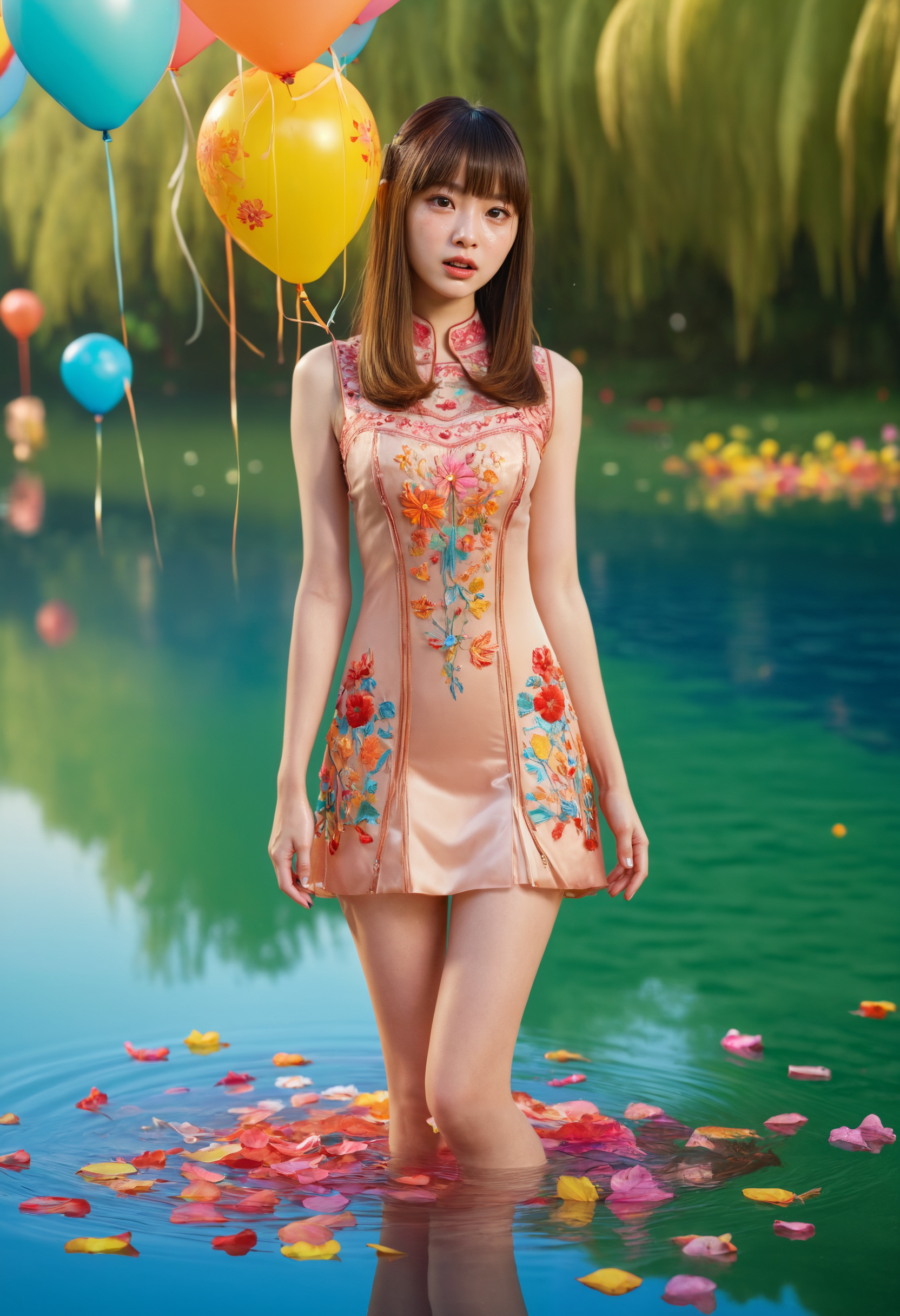 an Asian girl with a beautiful face and (pale skin:1.2), long brown hair and bangs, in an ornately embroidered microdress, stands in the park, the background is colourful flower petals and leaves floating on the water's surface, and the sky is filled with rising balloons, a highly detailed half-body shot, with a fresh and bright atmosphere, underwater lighting, 8K, cinematic
