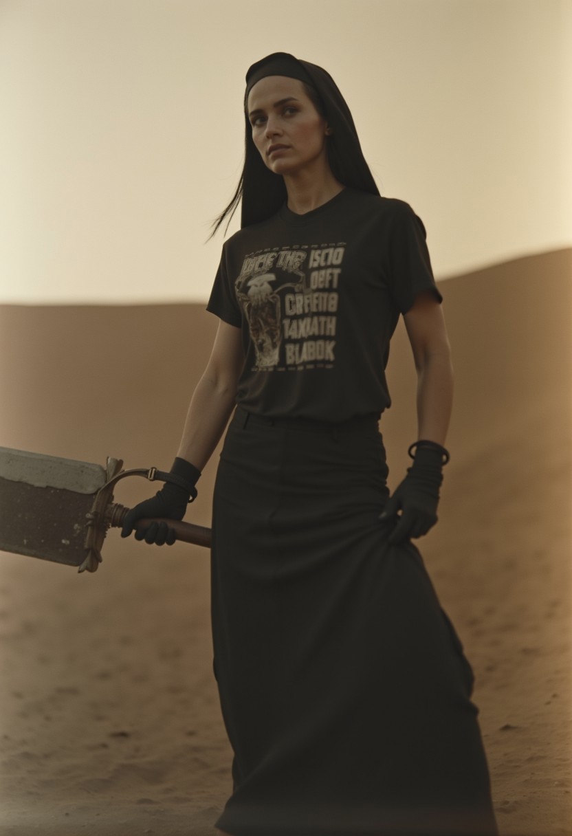 MF_AtomUltra, A powerful nun wielding a massive, old, and rusty sword resembling the iconic one from Final Fantasy. The scene is set during an eerie sundawn, where swirling dust and wind cause her translucent nun's habit to billow dramatically. The setting evokes a sense of mystique and tension. The nun stands tall, the rusted sword adding a gritty, ominous vibe. The sun's orange and gray hues blend into the sky as her tattered habit flutters. The atmosphere is cinematic, with hyper-realistic detail, soft shadows, and an intense, otherworldly mood in a desolate desert landscape. Moody Closeup Portrait, feudal Silk Road style, amazing quality, masterpiece, best quality, hyper detailed, ultra detailed, UHD, dof, hyper-realism, majestic, awesome, inspiring, A gritty Grindhouse film still inspired by "Death Proof": A muscular, athletic woman stands in the wind of a dusty desert in front of a Large fresh grave. Her torn metal print t-shirt and nun's habit glowing dress flap in the breeze. She holds an old, impressively large weapon in her hand, exuding a laid-back yet dangerous vibe. The photo features faded colors, with a limited palette of gray, beige, and washed-out orange, capturing her cool, striking appearance.. cinematic composition, soft shadows, national geographic style