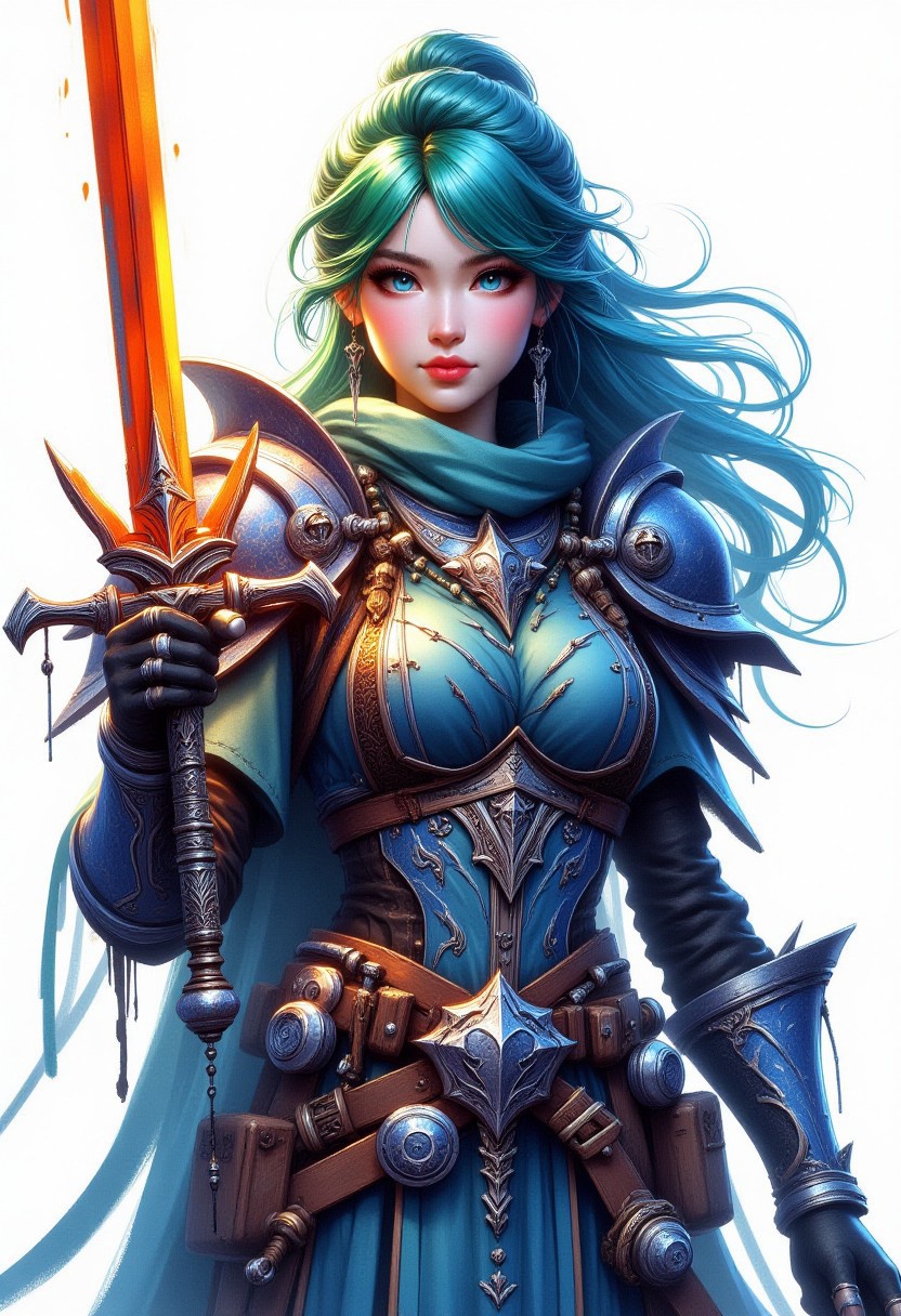 FFAOR, inksketch, 1woman, Frost Blue armor, sky blue eyes, orange glowing sword, cherry red lips, pine green hair, beautiful