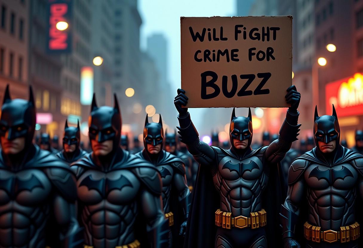 high quality, A group of Batmans protesting on a dark street, Holding Up a sign with the words "will fight crime for Buzz", beautiful masterpiece, wallpaper art, dark and brooding, full batman suits, best, dynamic composition, magnificent, intense, perfect background, war, fighting, fire in distance, angry, somber, tall city background, police car, slight rain,