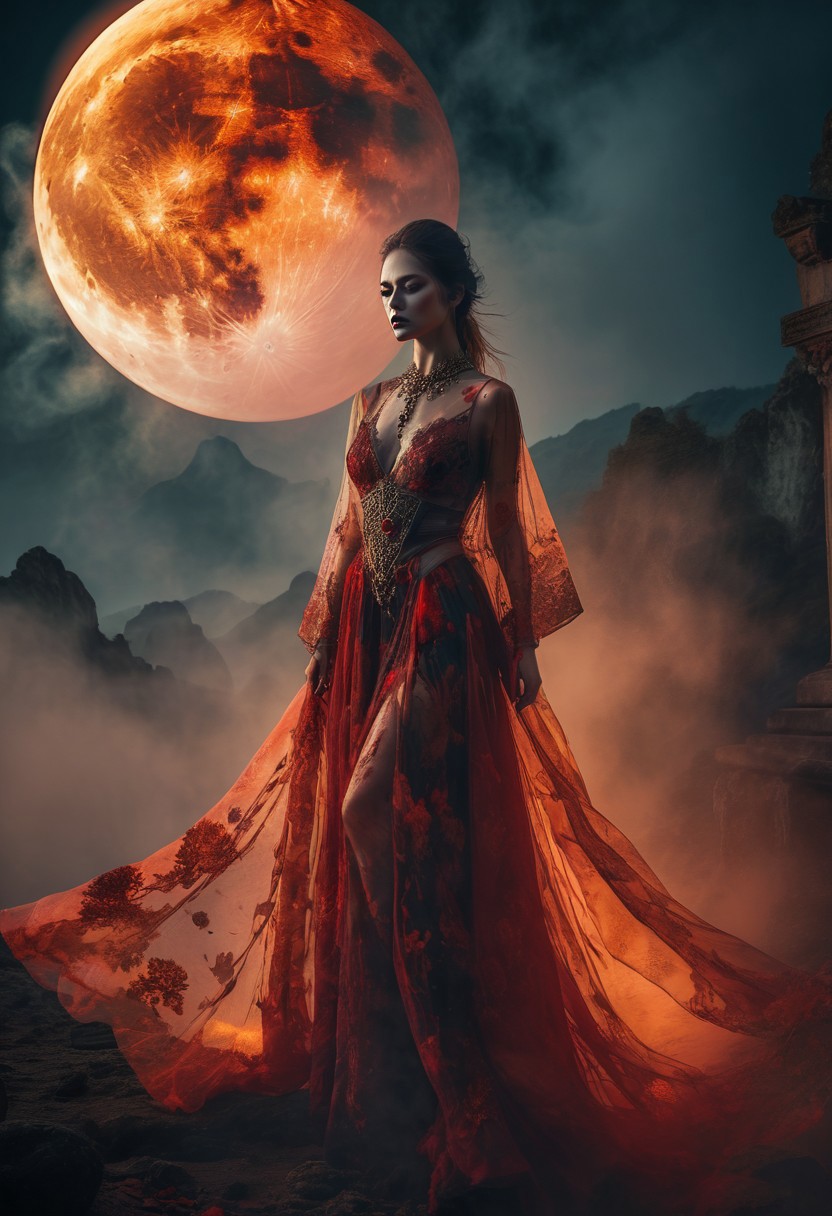 Luxury magazine phtotography, Full_body_Beautiful_seductive_enchantress, highly detailed dress, blood moon, red glow, mist, eerie Gothic aesthetic, double exposure photography, backlit, hyperdetailed double exposure, ancient female hero. a mysterious woman. seductive and sensual. a masterpiece, 8k resolution, highly detailed and intricate, vogue style