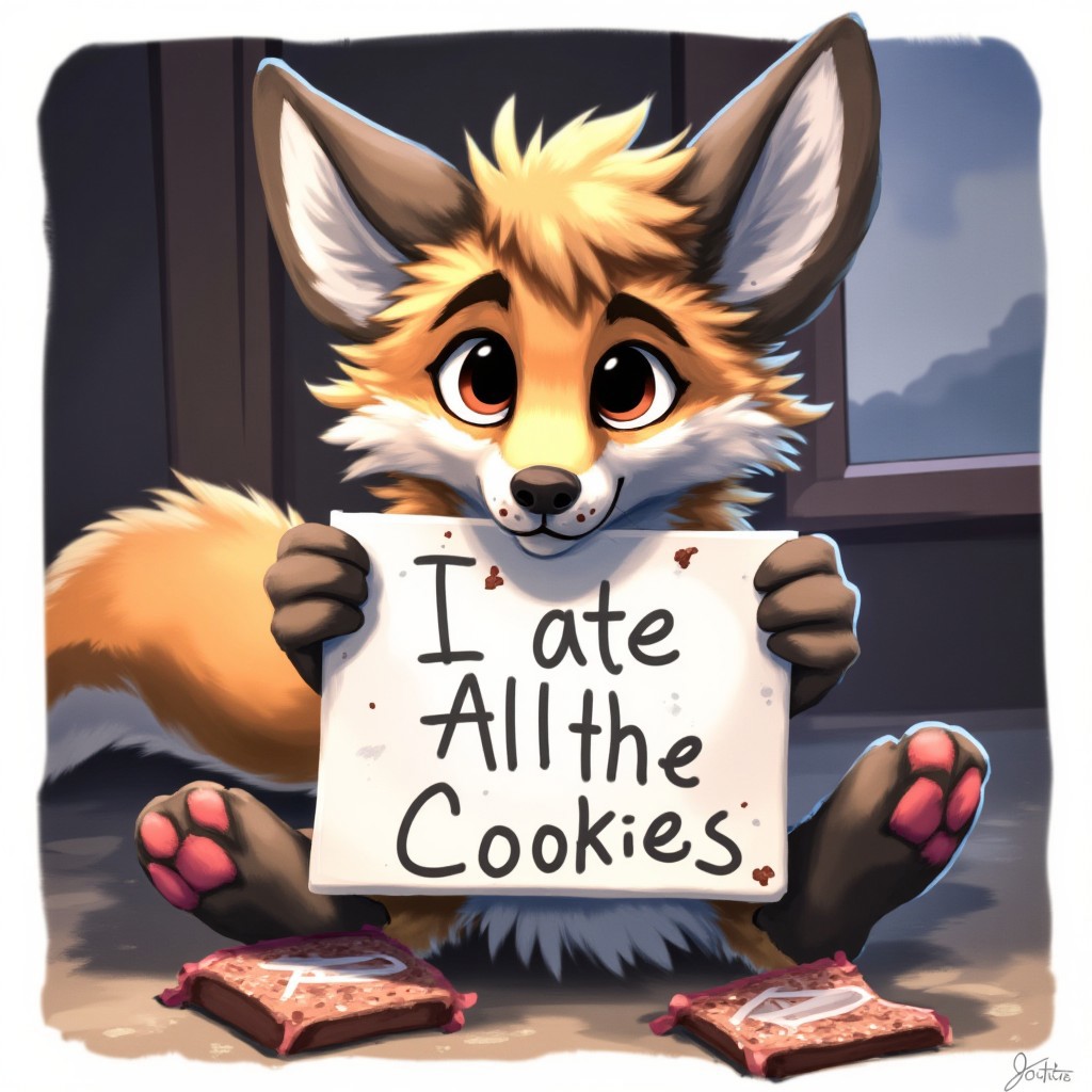 Highest quatliy, source anime, source furry, intricate detail, highest quality, an anthropmorphic arctic fox staring at viewer holding a sign saying, "I ate All the cookies" crumbs on face, discarded cookie packages in background,