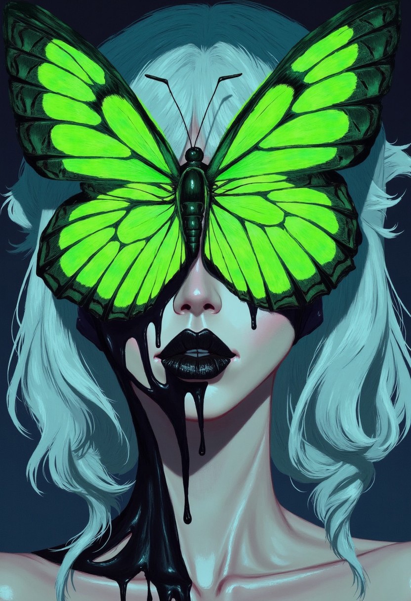 An Acrylic style painting that is expressive, gives it a dynamic and emotional quality.anime art of a stylized portrait of a woman with a dim green butterfly covering her eyes. The butterfly directly attached to her face, as if it were a mask creating a dramatic and surreal effect. The butterfly drips down her face in an oozing black liquid as if the butterfly were melting. The woman's lips are painted black, complementing the wings of the butterfly. the butterfly has a cold aesthetic, which sharply compliments her white hair. anime art of woman draped in shadows with a lighting that enhances her unique features.