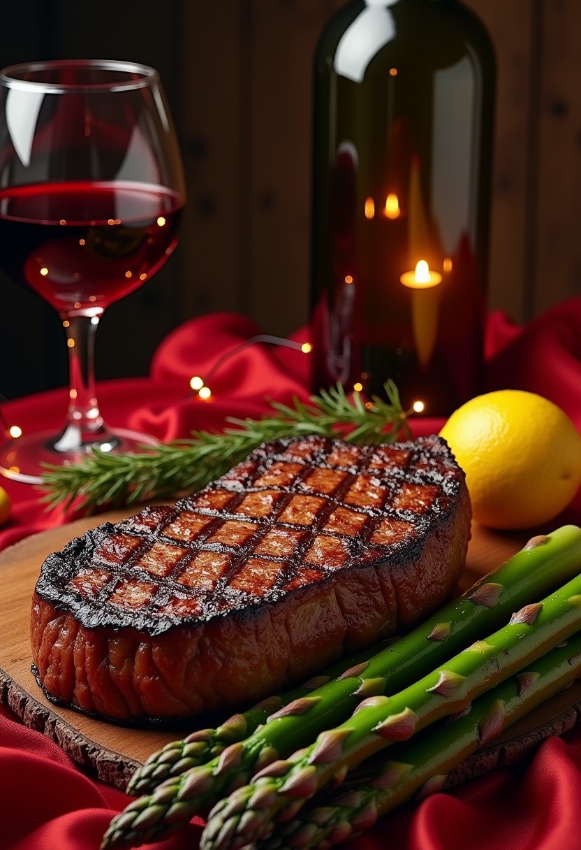 ASCIIInspired by the masterpieces of Frank Frazetta and J.C. Leyendecker, "Vibrant still lifes, Grilled steak, red wine, fairy lights, satin, oak. The whole picture is full of steak and asparagus featuring a variety of objects and textures rendered in stunning detail." Still life, poetic