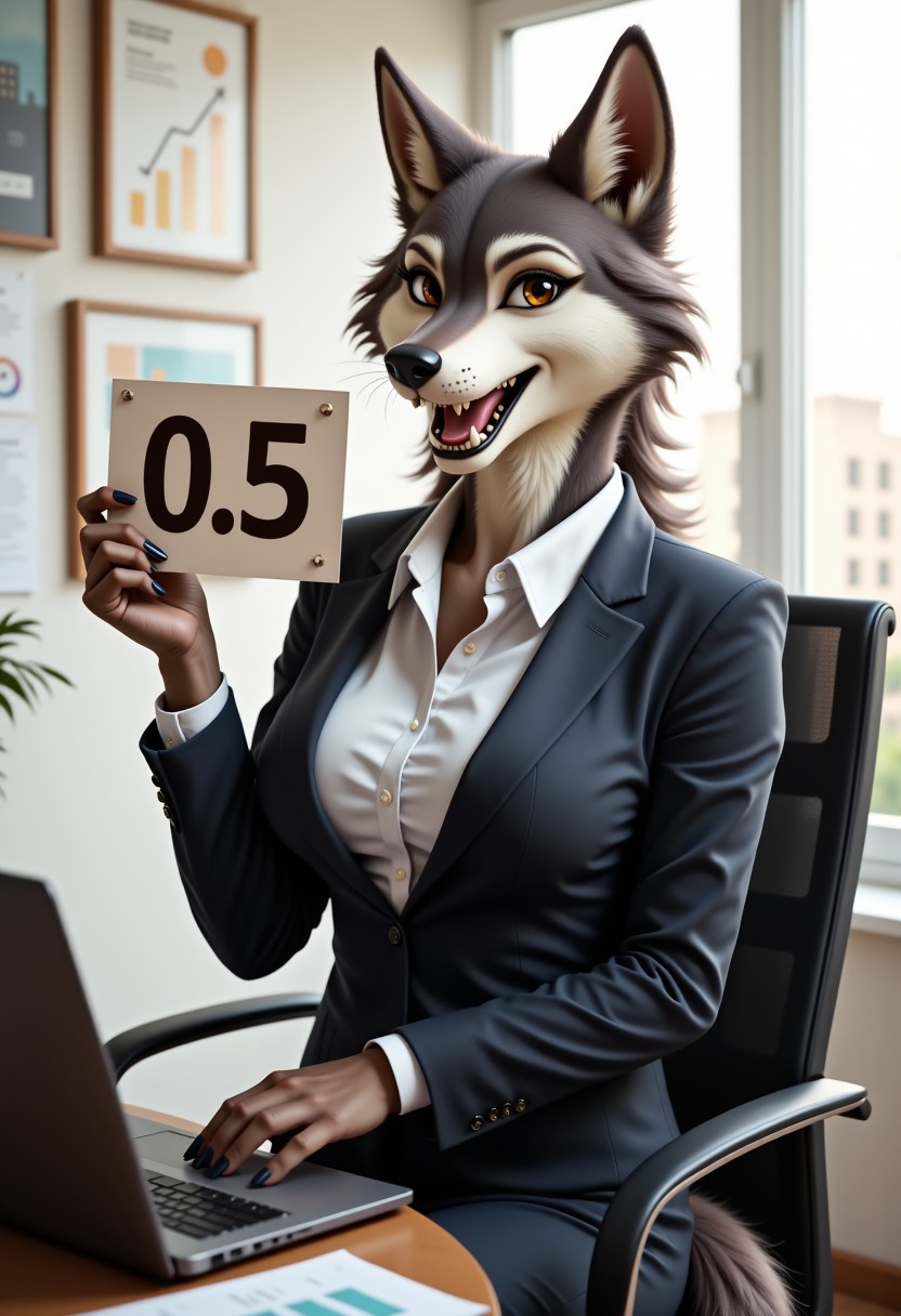 A beautiful, slender, mature furry female wolf woman is wearing a business suit. She is sitting in an office, next to her laptop. She is looking at the viewer happily with an open mouth exposing her fangs. She has a wolf tail and paws. She is holding up a sign that says "0.5"