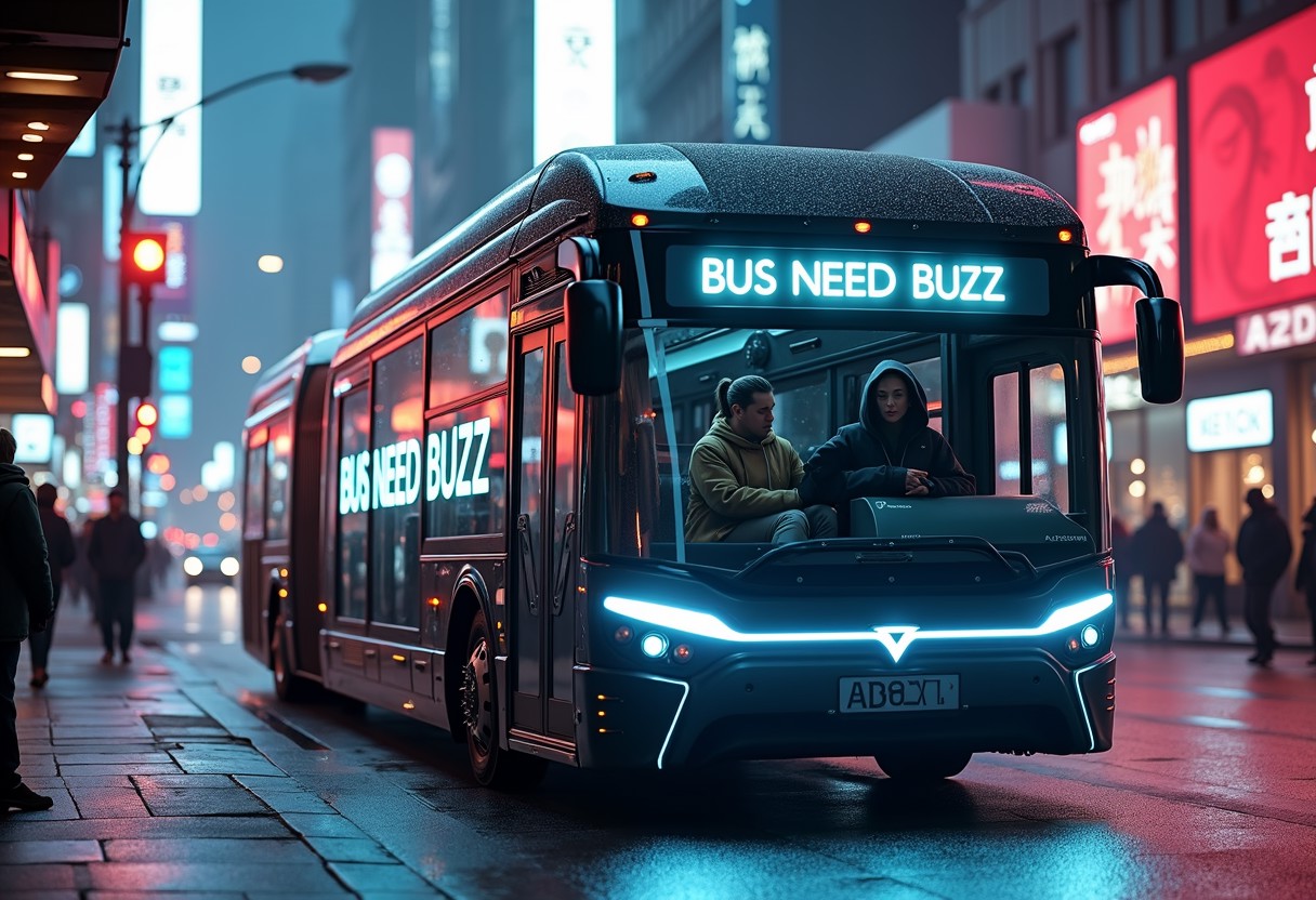 cyberpunk like, scene, a bus is photographed from the side, Futuristic modern black and white tesla bus, starship kind, in a futuristic city, street full of cars and people, without signs or texts, on the side of the bus a big neon text that says "BUS NEED BUZZ", futuristic typeface, modern futuristic landscapes