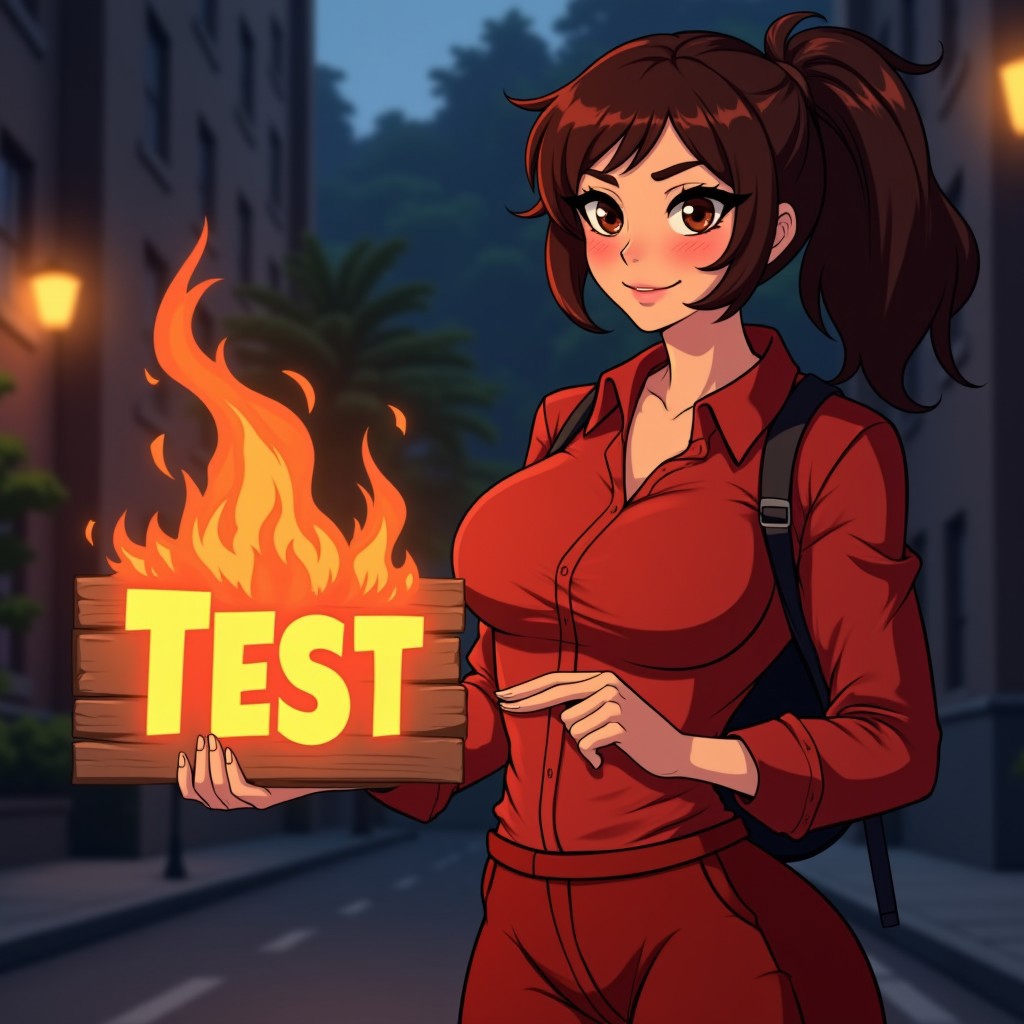 a cartoon image of a female in a red clothes, holds up a burn sign that says “TEST” lit. outdoors blurred background