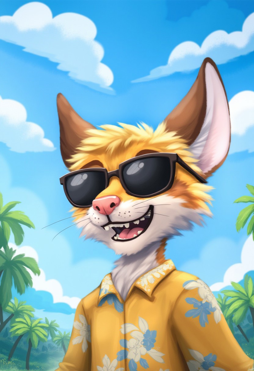 yellow cat, wearing sunshades, happy, whiskers, smiling, sunny, clouds, blue sky, palm tree, wearing a Hawaiian shirt,