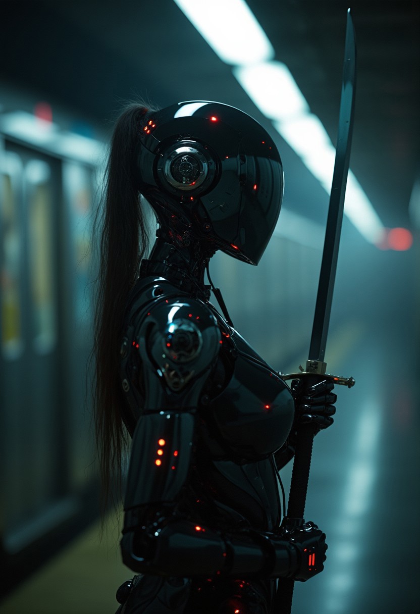 a cyberpunk robot samurai woman, robot face with mirrored face shield, robot joints, body made of metals, cables and wires, holding a katana by the hilt, in a cyberpunk subway station, dim lighting from overhead strip lighting, silhouetted in the gloom. Perfect Composition, realistic photographic image, RAW photo highest quality, perfect directional lighting