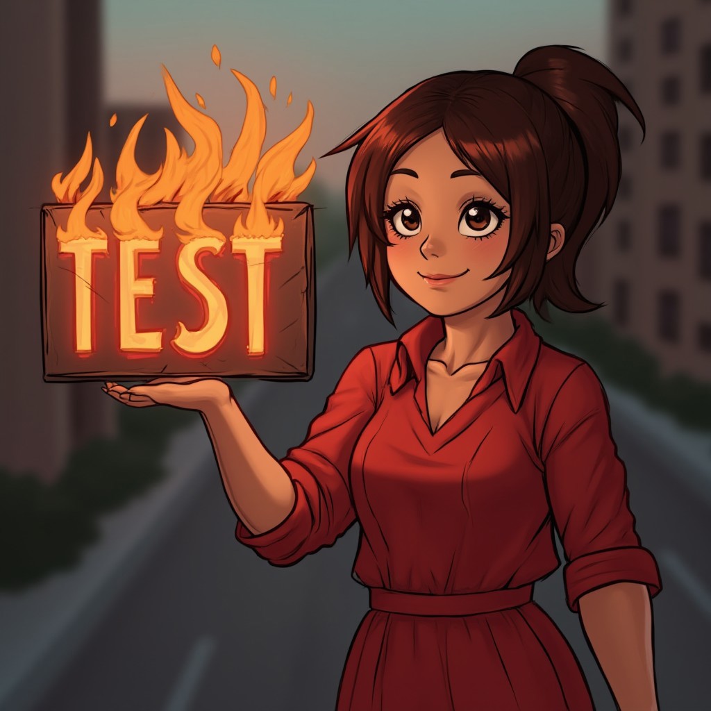 a cartoon image of a female in a red clothes, holds up a burn sign that says “TEST” lit. outdoors blurred background