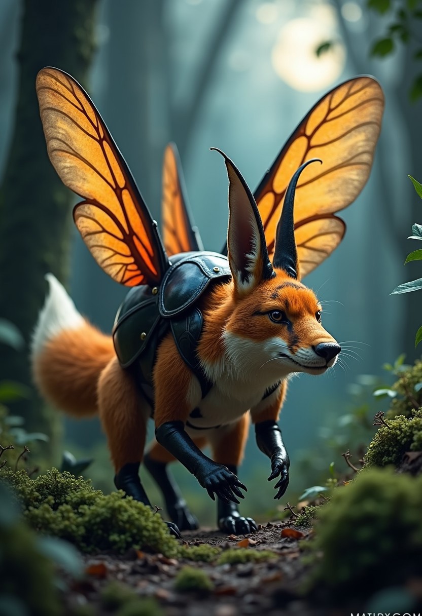 Capture a hyper-realistic photograph of a unique and powerful hybrid creature, combining elements from both the insect and mammal worlds. This creature has the sleek, cunning face and bushy tail of a fox, paired with the small, fluffy body of a rabbit. Its fur is striped in bold orange and black like a tiger, while its back is adorned with large, soft moth wings that shimmer in muted tones. The creature's body is further enhanced by a dark, glossy, armored shell similar to that of a beetle, complete with a large, curved horn at the front. The scene is set in a dense, ancient forest under the light of the moon, with the creature emerging from the undergrowth, its horn glinting in the dappled light as its wings gently flutter.