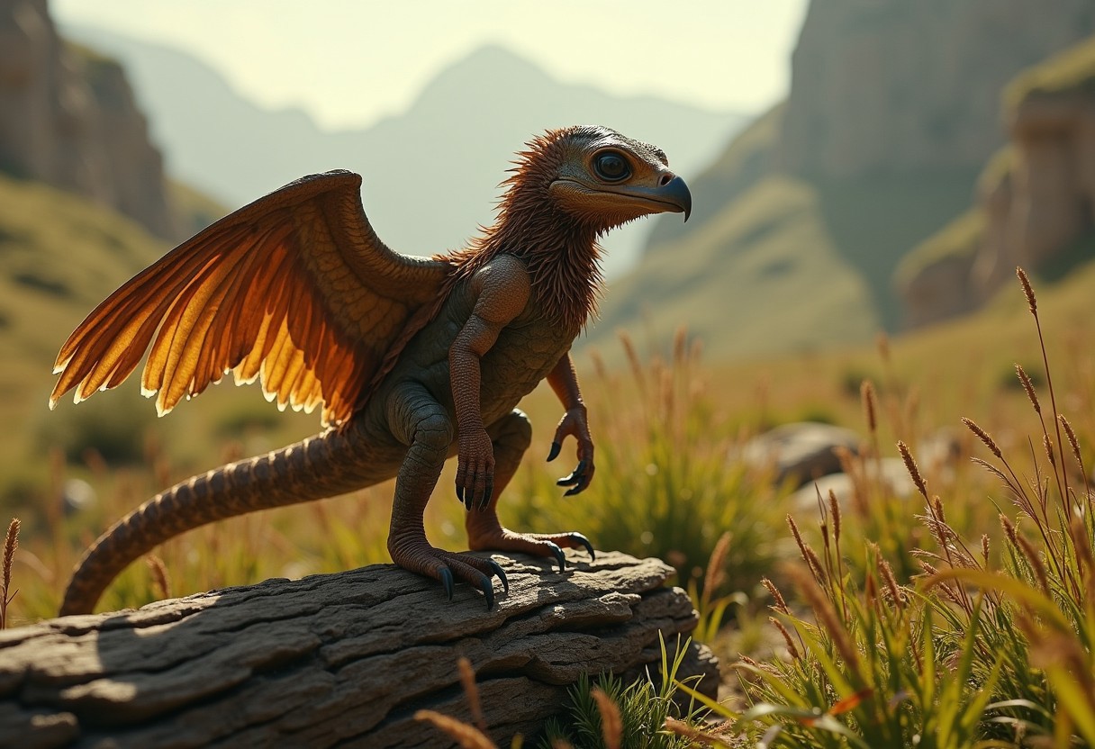 A picture of an alien life-form, a newly discovered species from another planet, mammal-like, strange creature, cryptid, an animal that resembles a cross between an iguana and an eagle, medium creature, winged, neck frills, clawed talons, the creature is standing on a log by a wild meadow, bizarre plants and unknown mosses and ferns on a planet with less gravity, weird plants, epic lighting