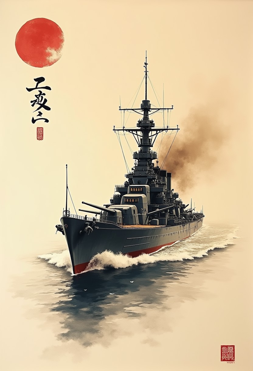 traditional japanese art style, ink on paper, WW2 battleship IJN Akagi, wabi-sabi, henna and carmine, sepia, minimal brush strokes