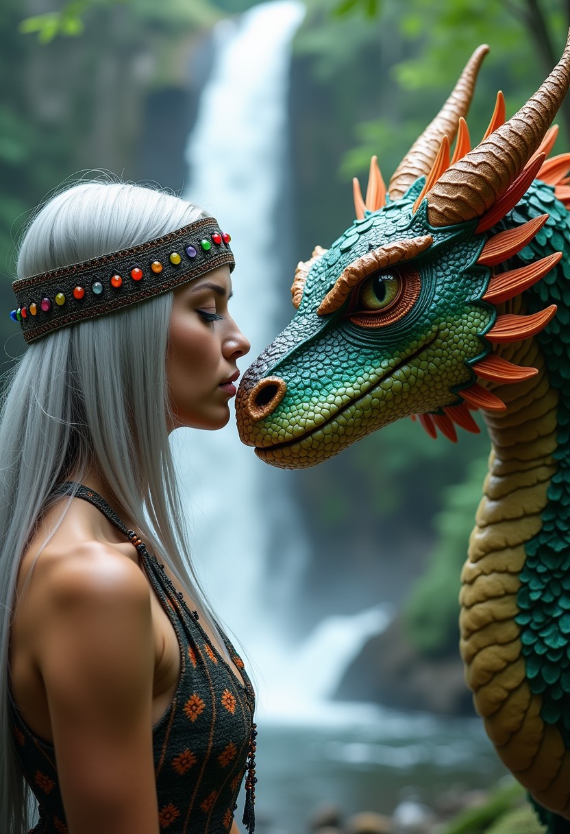 "A mystical scene featuring a powerful woman with silver hair, wearing an intricate, multicolored beaded headdress adorned with feathers and gemstones. She stands in a serene forest, facing a large, majestic dragon with iridescent, scaly skin that reflects hues of green, blue, and orange. The woman and the dragon are in an intimate moment, with their foreheads touching gently, symbolizing a deep connection between them. The dragon's eyes are wise and full of ancient knowledge, while the woman exudes strength and calm. The background is softly blurred, showcasing a waterfall cascading down in the distance, adding to the ethereal and peaceful atmosphere. The overall aesthetic is a blend of fantasy and nature, with a focus on the bond between the woman and the dragon, detailed textures, and a harmonious color palette.", photo, cinematic