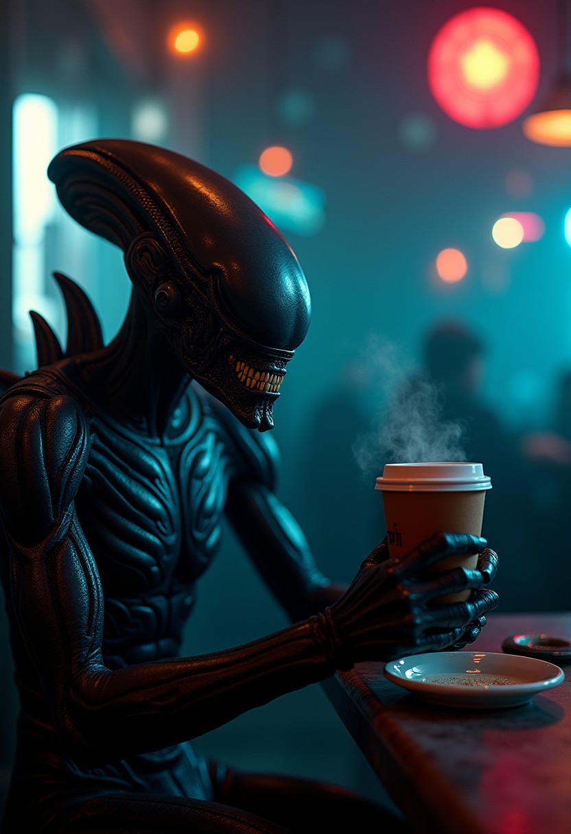 (photography), (cinematic lighting:1.5) alien monster, toned legs, six pack, front view, futuristic complex carbon suit, (intrincated details suit), slender, extremely narrow waist stunning eyes,,large, sharp teeth, horror, terror, close up, solo, eyes sitting in a cafe drinking a coffee, xenomorph, neon lights, (detailed scene), volumetric light, haze, fog, XenoFlux, Slime, detailed scene photo (medium), slime body, daft punk helmet,
