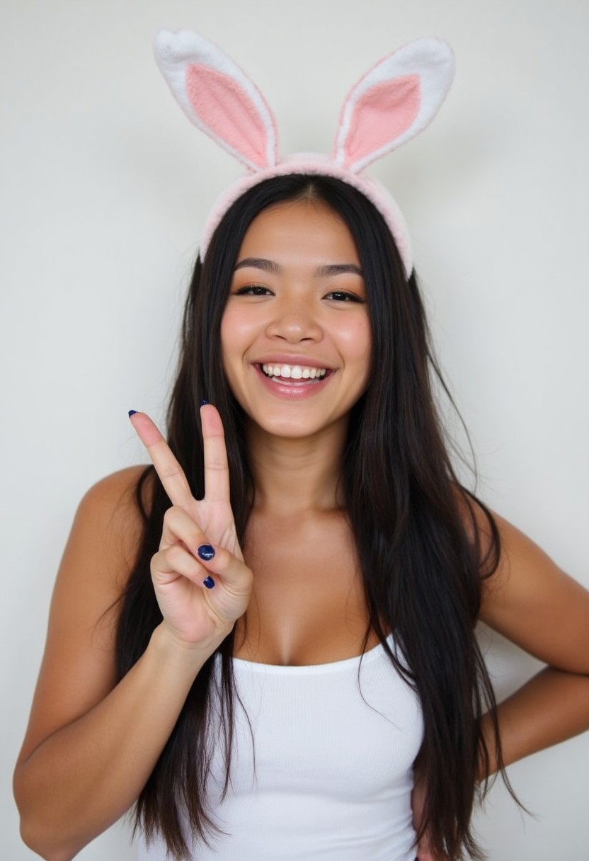 The image is a selfie of a young woman with long dark hair. She is wearing a white tank top and has a pair of bunny ears on her head. The bunny ears are pink and white and are attached to the top of her head with small ears. She has a big smile on her face and is making a peace sign with her right hand. The background is a plain white wall.