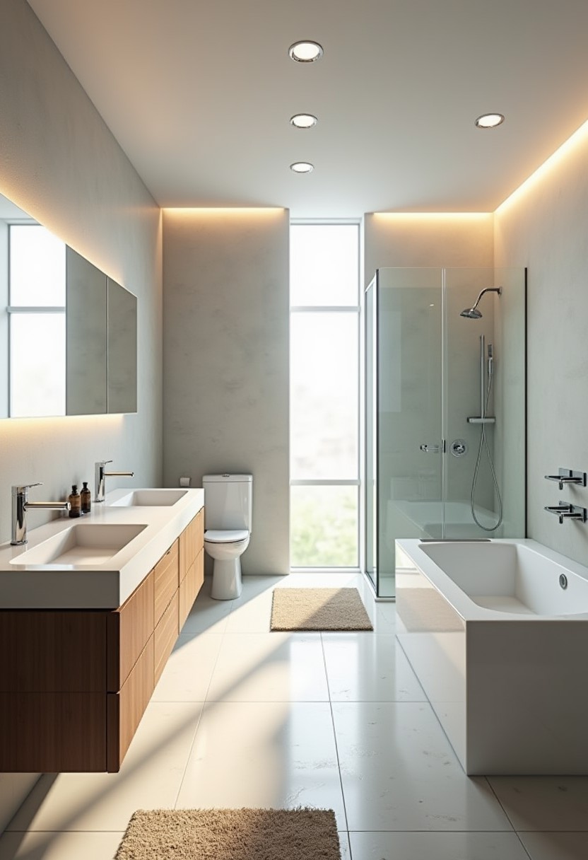 high-quality, photorealistic image of a modern bathroom. This bathroom has a two sinks with a long mirror over them, a tub against one wall and a glass, walk-in shower near it. There is a rug on the floor.
