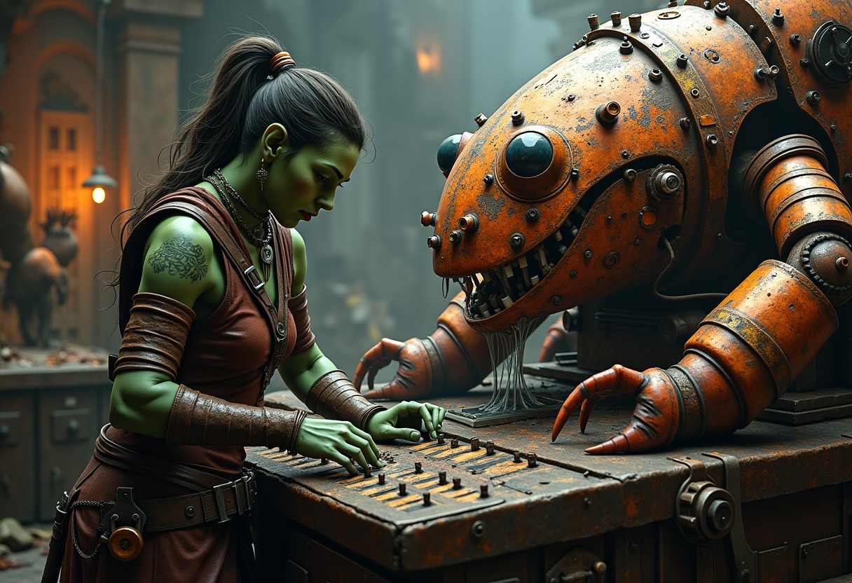 A greasy female green-skinned orc engineer is working at an immense bizarre steampunk machine with many controls, multiple status monitors and gauges, steam leaking from a few valves, the machine looks like a large mechanical crab with copper and bronze engraved plates and gold accents, an amazing automaton of steam engineering, creepy Dwemer vibe,