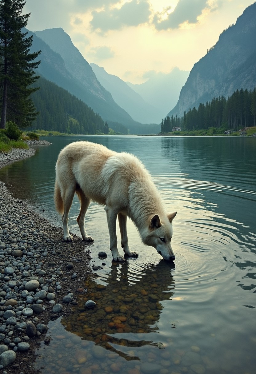 Closeup of a white wolf on a gravel beach drinking from a large river in an idyllic countryside valley with mountains all around. Occasional steep cliffs surround the river on both sides. The vegetation is lush and there are sparsely spaced trees nearby and a forest in the distance. The late evening sky is cloudy and the sky has a tinge of yellow towards the horizon. The scene has vibrant and painterly colors.