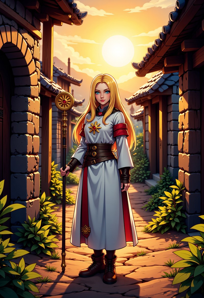 anime style, a dirt path in a small medieval village, 1 middle aged woman is standing on the dirt path, blonde long hair, slim figure, weary eyes, wearing a white cleric robe with red details and a sun symbol on her white robe she is holding a small scepter with a sun symbol, brown belt, brown boots, the evening sun shines, ambient light