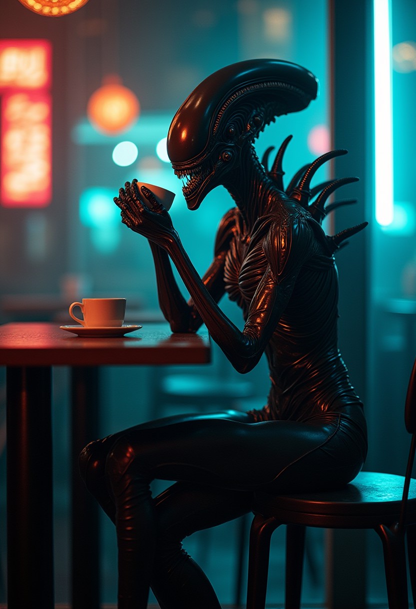 (photography), (cinematic lighting:1.5) alien monster, toned legs, six pack, front view, futuristic complex carbon suit, (intrincated details suit), slender, extremely narrow waist stunning eyes,,large, sharp teeth, horror, terror, close up, solo, eyes sitting in a cafe drinking a coffee, xenomorph, neon lights, (detailed scene), volumetric light, haze, fog, XenoFlux, Slime, detailed scene photo (medium), slime body, daft punk led helmet,