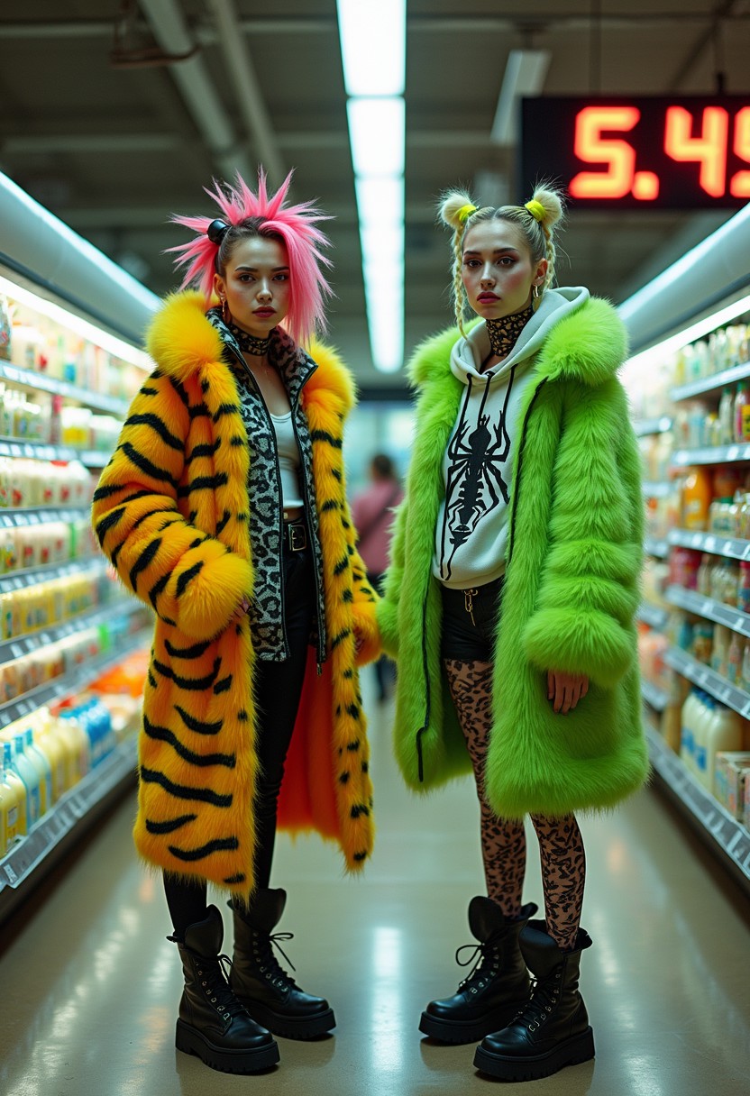 Two punk-styled women stand boldly in a grocery store aisle, surrounded by cartons of milk and bright, neon price signs. They wear eye-catching, oversized fur coats—one in neon yellow and tiger stripes, the other in green with zebra patterns—complemented by vibrant, clashing accessories like spider web hoodies, patterned tights, and chunky boots. Their makeup is fierce and exaggerated, with sharp eyeliner and vivid colors. Their hair is styled into extreme spikes and braids, reflecting a rebellious, cyberpunk aesthetic. The scene exudes a mix of dystopian street fashion and retro-futurism, with a playful yet intense mood, like a vibrant snapshot from an alternate punk reality.