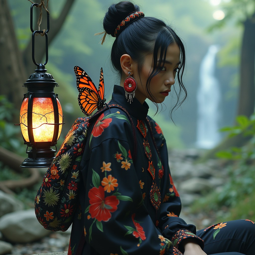 bug, upper body, sitting, butterfly, earrings, lantern, black hair, heterochromia, scenery