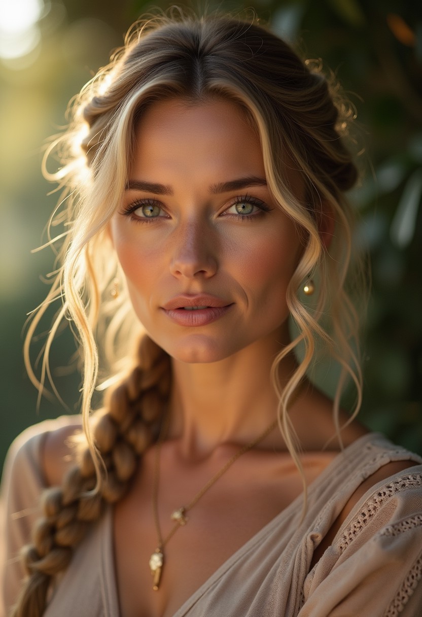 A 40-year-old woman with blonde hair styled in braids, poised confidently while clothed in elegant, tasteful attire, textures soft to the touch, light cascading gently through her hair, subtle bokeh background highlighting her as the focal point, natural skin tones bathed in warm, golden light, portrait mode, high-key lighting, shallow depth of field, aperture F 1.8, fine art