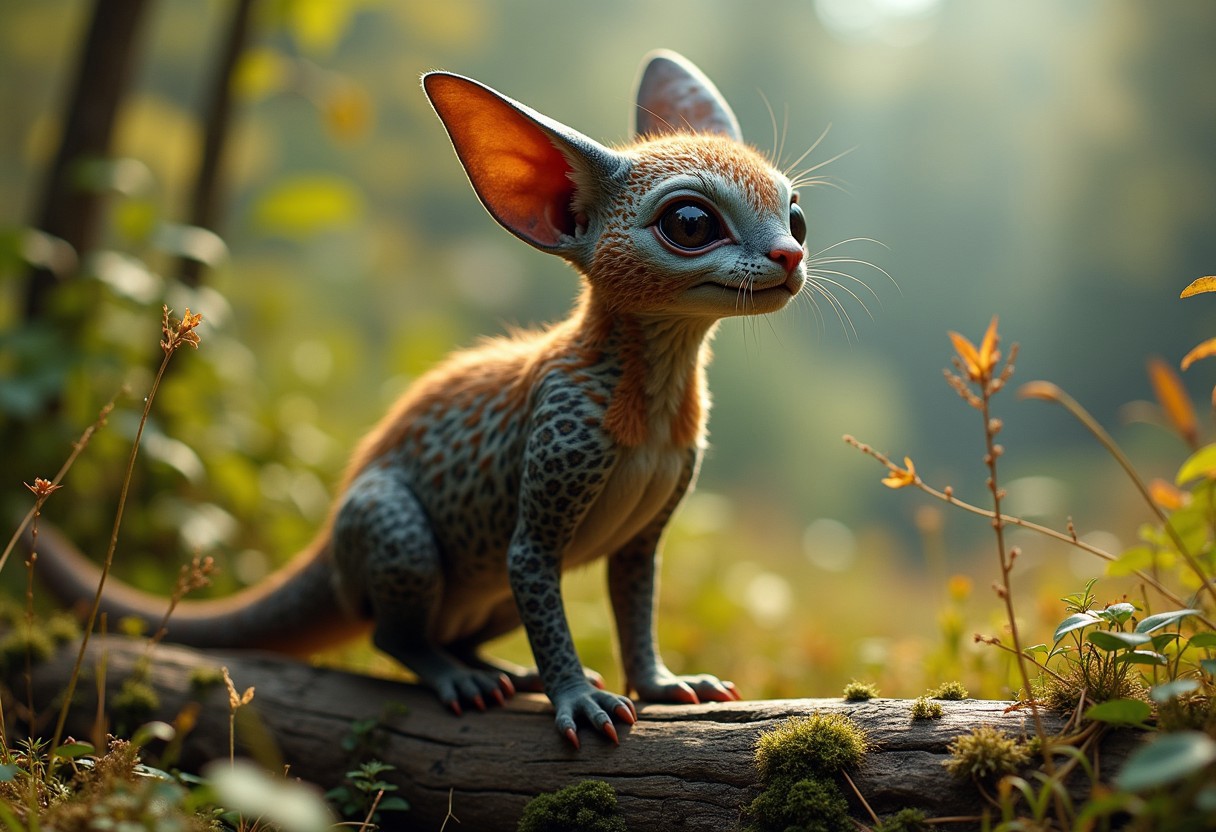 A picture of an alien life-form, a newly discovered species from another planet, mammal-like, strange creature, cryptid, an animal that resembles a cross between an duckbilled platypus and a serval, strange colored fur with tabby patterns, the creature is standing on a log by a wild meadow, bizarre plants and unknown mosses and ferns on a planet with less gravity, weird plants, epic lighting