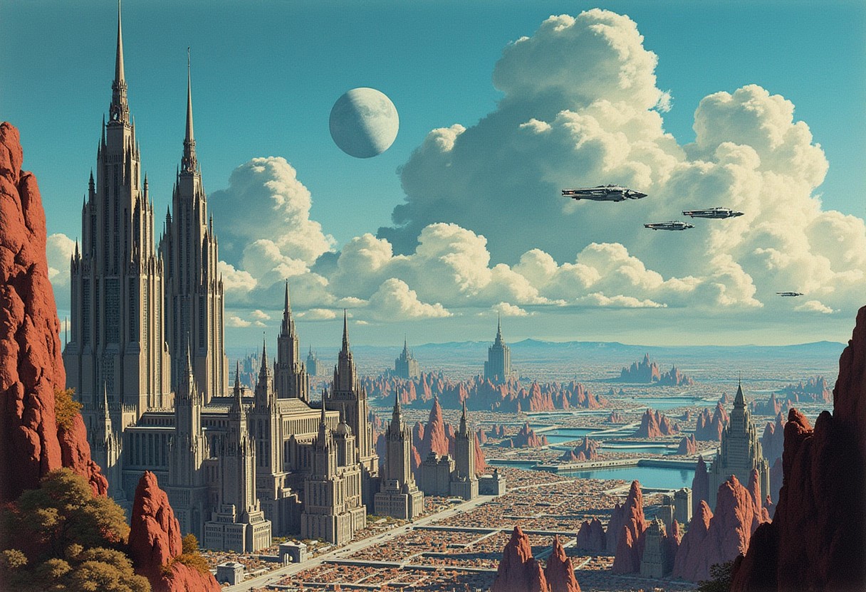 Ralph McQuarrie Style illustration of a cityscape, densely urban area without natural features (cityscape:1.3) with massive gothic buildings two, pyramidal buildings, a palace and skywalks, crescent moons and tiny flying spaceships in a line