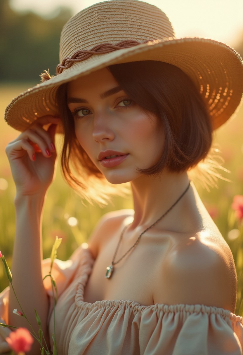 medium shot,side view,charming woman,pale skin,detailed skin texture,pointy nose,holding a braided wide brimmed hat with hand,bob cut,big breast,cleavage,pendant,long sleeve off shoulder dress,flowering meadow,rule of thirds,golden backlight, photorealistic,film grain,color graded cinematic,eye catchlights,bloom,depth of field,sophisticated details