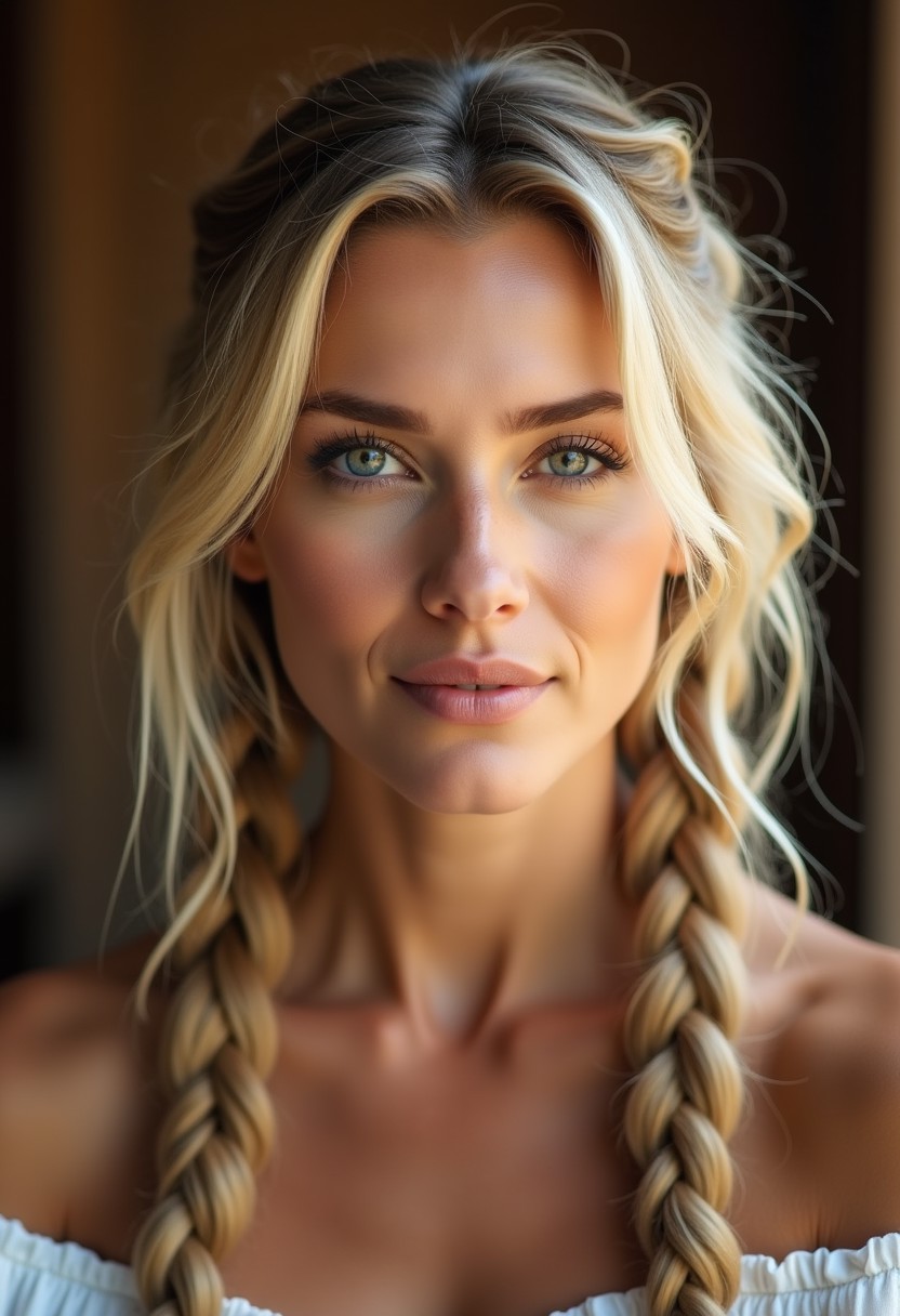 A 40-year-old woman with blonde hair styled in braids, poised confidently while clothed in elegant, tasteful attire, textures soft to the touch, light cascading gently through her hair, subtle bokeh background highlighting her as the focal point, natural skin tones bathed in warm, golden light, portrait mode, high-key lighting, shallow depth of field, aperture F 1.8, fine art