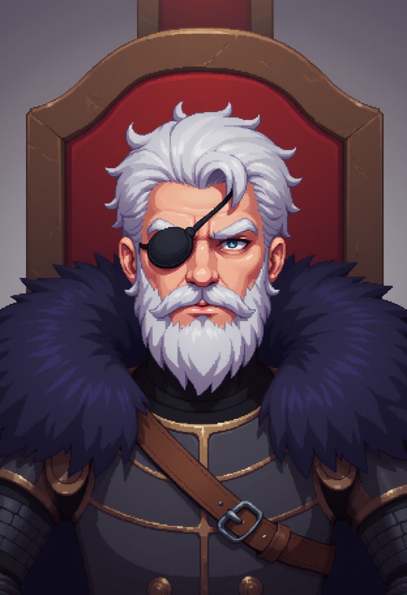 Pixelart, skindentation, 1boy, beard, eyepatch, white hair, scowl, raven, barbarian, fur trim, armor, serious, throne