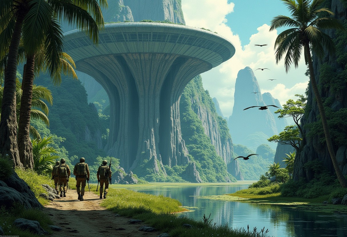 Ralph McQuarrie Style illustration of a group of soldiers walking away from a massive jungle re ple surrounded by swampy water and alien birds