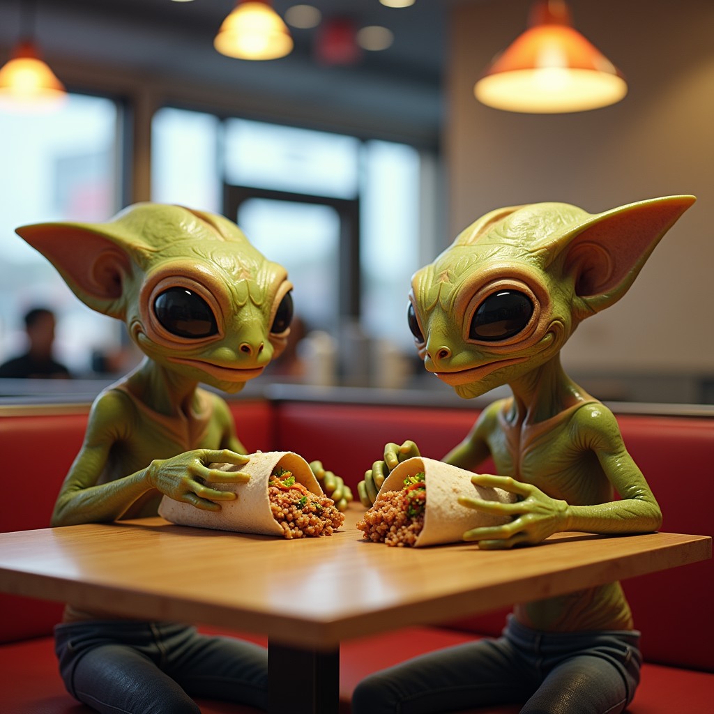 Two bizarre alien creatures, sitting at a table at Taco Bell, eating burritos and chatting, having a great time, photo
