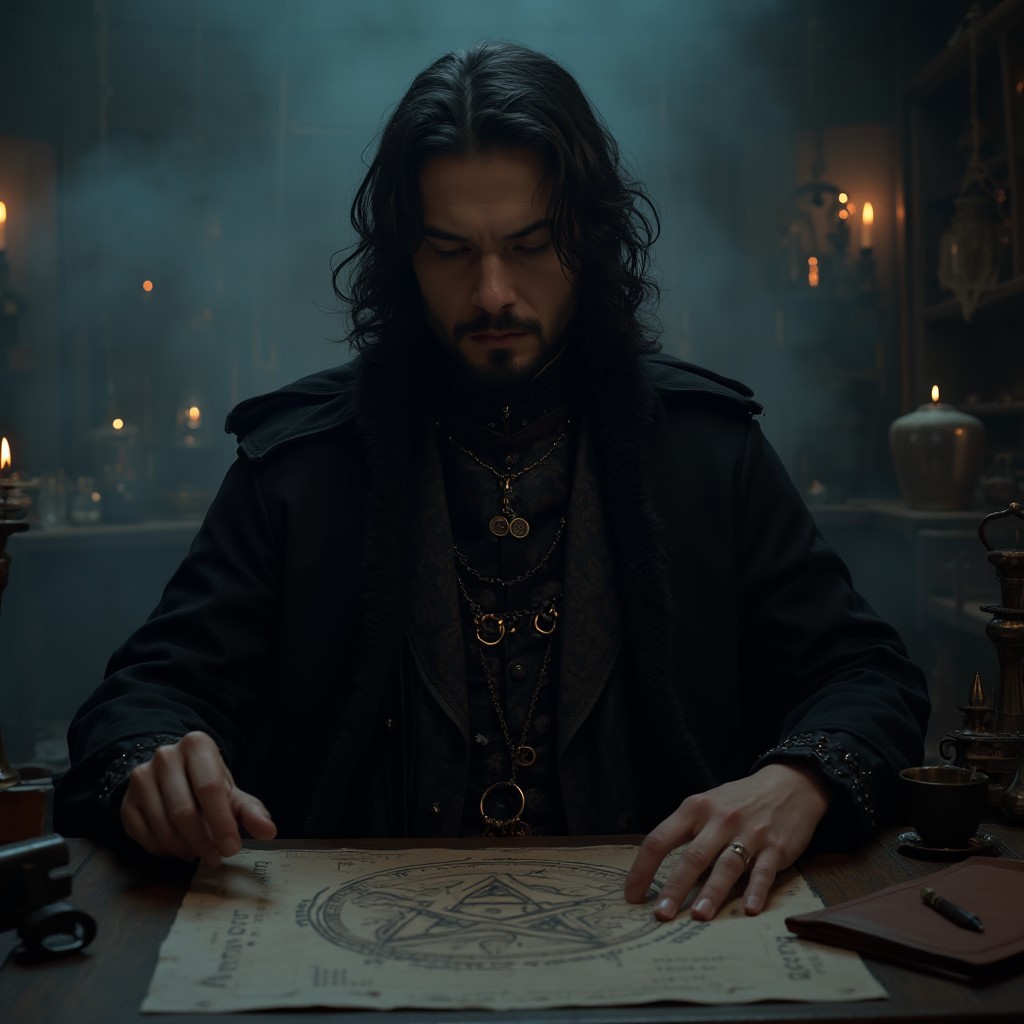 black wizard, male 30yo, concentrated, serious expression, elegantly adorned, reciting dark spell above a rune-adorned table with a pentagram and magical trinkets, full body, black cape and mantle, dark long wavy hair, misty magical background set in a fantasy-like magic laboratory, dark gothic atmosphere, aura of dark magic enhance the mystical atmosphere of the image, enhanced realism, smooth skin, (maximum ultra high definition image quality and rendering:3), maximum image detail, maximum realistic render, (((ultra realist style))), realist side lighting, 8K high definition