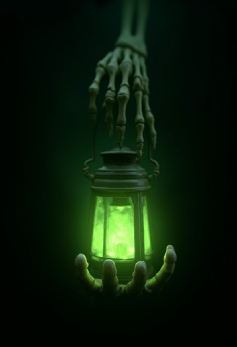 A highly detailed medieval lantern held by a skeletal hand, glowing green, on fire, infernal flames, magic glow, green ambers, fantastic, glowing green core, pitch black background, background illuminated by lantern only, masterpiece, realistic, best quality