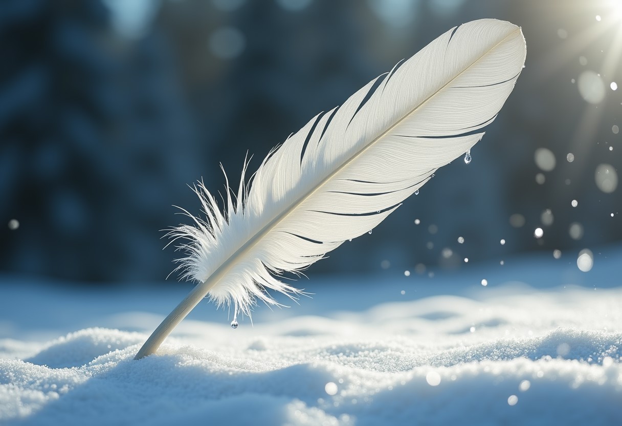 a giant feather quill, elegantly curved and white as snow, is embedded into the ground. From its tip, instead of ink, a delicate stream of water flows, cascading down like a waterfall. The quill’s plume is adorned with dew drops that catch the light,