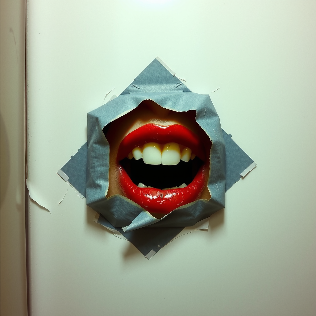 a small dark round hole crudly trmerd with duct tape in the devider of a public bathroom stall. a pair of ruby red lip can be seen in the hole flashing a wide smile as the teeth bite on a finger.