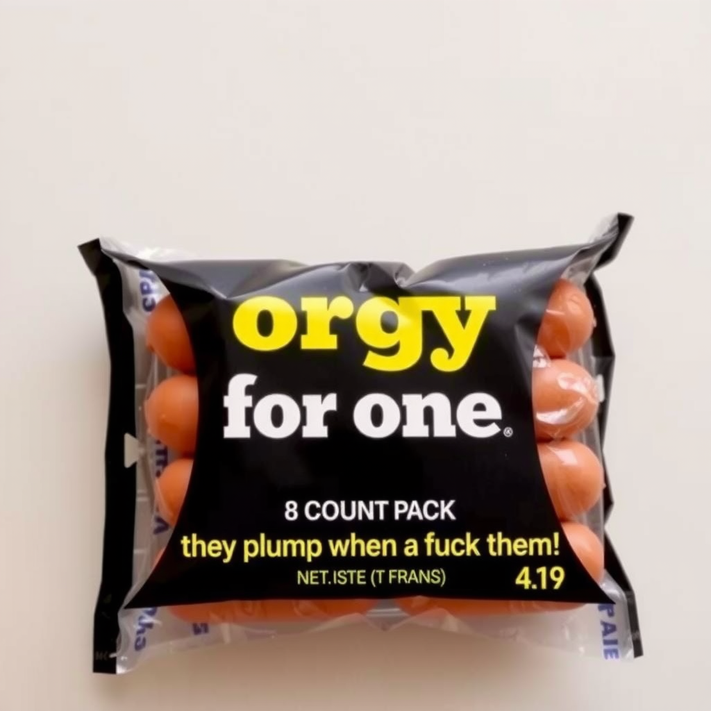 8 count pack of packaged cream filled hotdog franks that read "orgy for one". "they plump when you fuck them!" "NOW WITH CREAM!!!"
