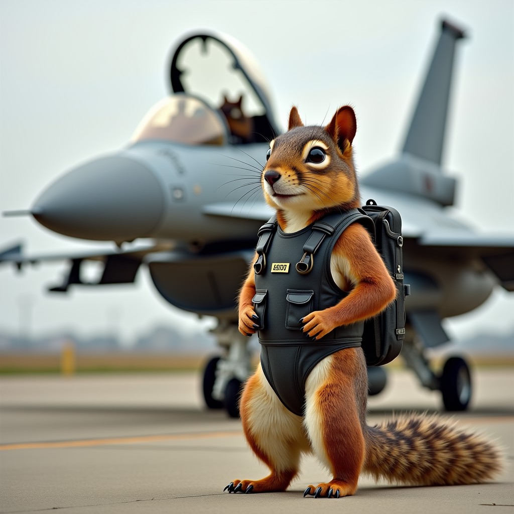 A squirrel dressed as a fighter pilot standing beside a fully loaded F-16 ready for take-off