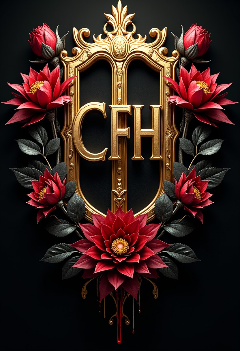hud_m4x_4bstr4ct_styl, abstract, colorful, Design a "CFH" logo as a gleaming golden chrome emblem with intricate filigree. Emphasize reflective surfaces and liquid-metal appearance. Surround with black lotus and dark red roses, integrating bio-mechanical elements: thorny stems resembling cables or pistons, flowers with metallic undertones. Blood and oil should drip from leaf-like vents or ports. Create as high-quality vector for sticker use. Render in 8K with stark contrast between deep shadows and brilliant highlights on the reflective gold surfaces. Blend luxury and danger with a sci-fi, organic-tech aesthetic.