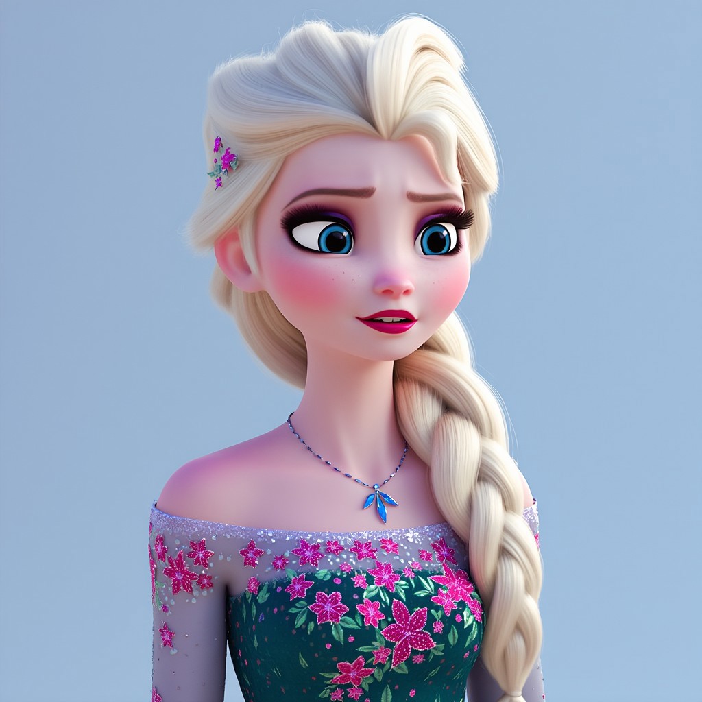 waist up view:1.3, 1girl, elsa \(frozen\), solo, necklace, jewelry, freckles, bare shoulders, open mouth, upper body, Braid on right shoulder, portrait, civitai elsa, blue eyes, Elsa's Floral Dress, outfit 3, elsa's outfit-3, elsa's outfit-3 \(outfit\), two noticeable front teethï¼view from font ,(((waist-up view))),