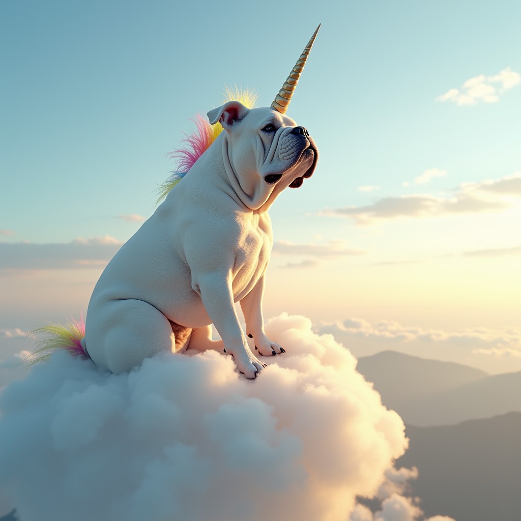 Imagine a hyper-realistic photograph of a white bulldog unicorn perched comfortably on a fluffy cloud high in the sky. The bulldog’s muscular, wrinkled body contrasts beautifully with the soft, ethereal cloud beneath it. From its forehead, a short, spiraled unicorn horn glistens with a soft, pearly sheen, catching the sunlight that filters through the sky. Small, delicate rainbow feathers adorn its back and shoulders, shimmering as they gently flutter in the breeze. The bulldog unicorn’s white fur appears almost luminous against the bright blue sky, with a few wisps of clouds drifting lazily around it. The creature sits contentedly on the cloud, its paws tucked under its sturdy body, exuding an air of both strength and tranquility. Below, the vast expanse of the sky stretches out, with hints of distant mountains barely visible through the mist. The scene is bathed in the warm, golden light of a setting sun, casting a magical glow across the cloud and highlighting the bulldog unicorn’s unique and enchanting features. The atmosphere is serene and otherworldly, capturing a moment of pure, fantastical peace in the sky