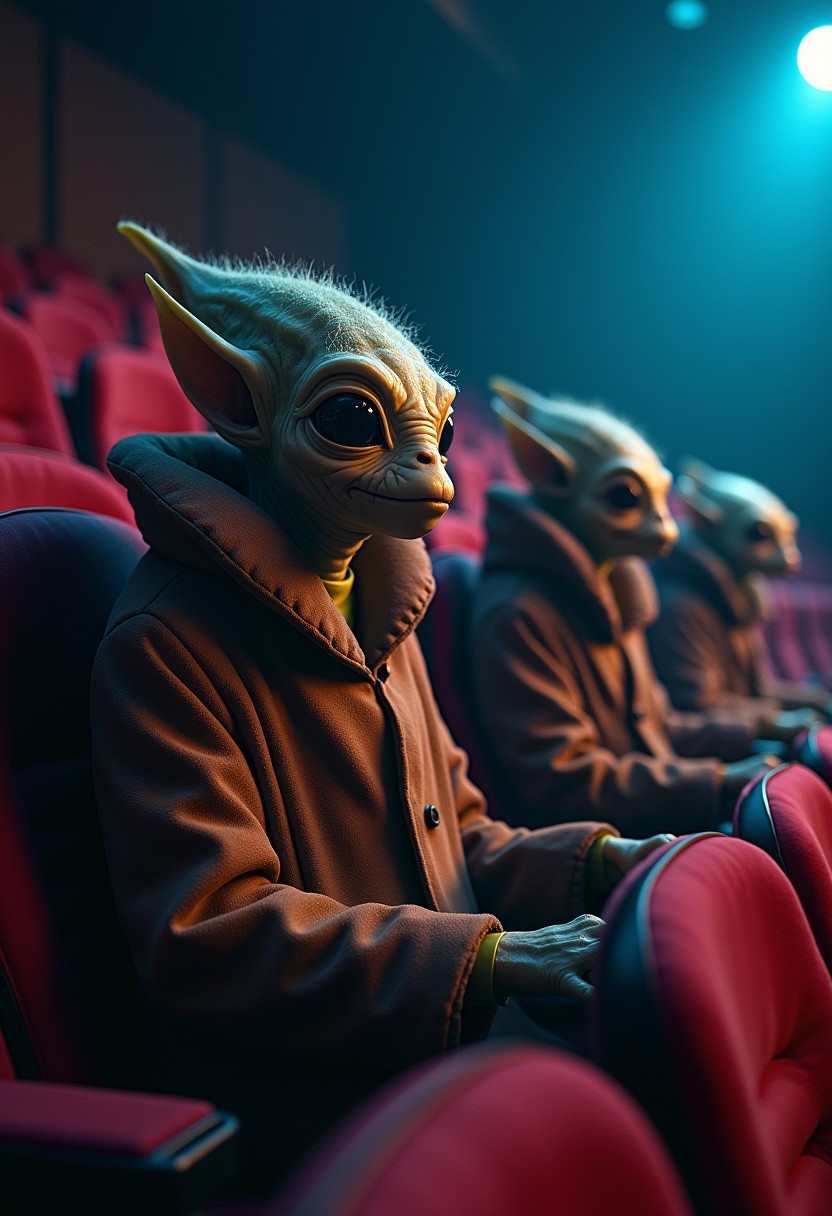 3 funny looking aliens inside a trenchcoat go to the cinema,they are paying for the entry to watch a movie,movie theater,night time