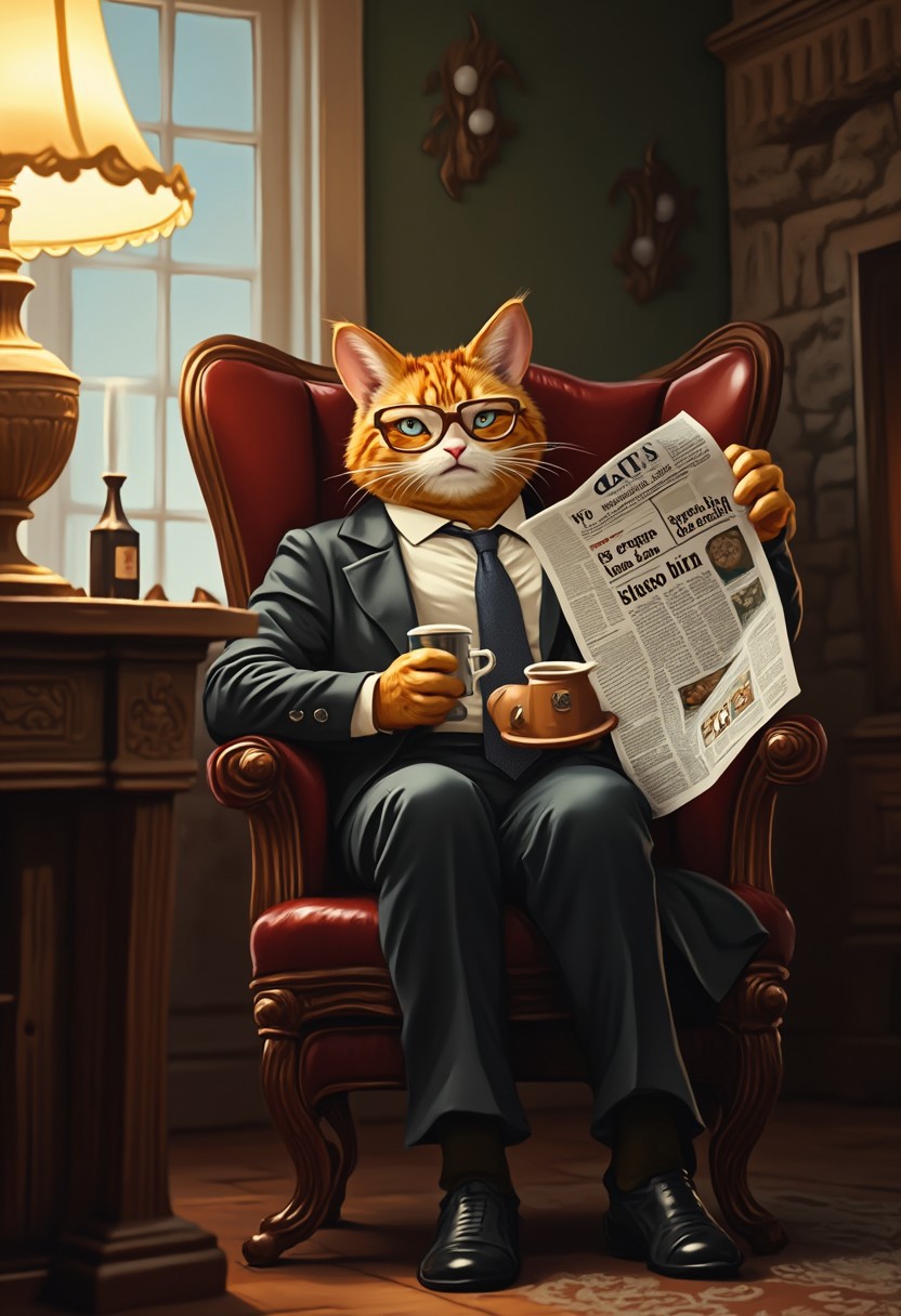 A humanoid cat is sitting in an armchair and drinking coffee, he is dressed in men's clothes of an American office worker of the 80s, drinking hot coffee and reading a newspaper, wearing glasses, a man is sitting on his knees in the pose of a cat, sleeping on his knees in the pose of a cat sleeping on his knees, by the fireplace. The headline on the newspaper is we need bizz