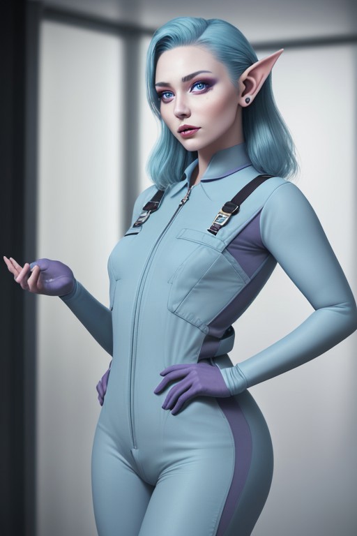 alien woman, very short, curvy, toned, pale blue skin, large pointed ears, almond shaped eyes, violet colored eyes, small nose, wearing futuristic coveralls.