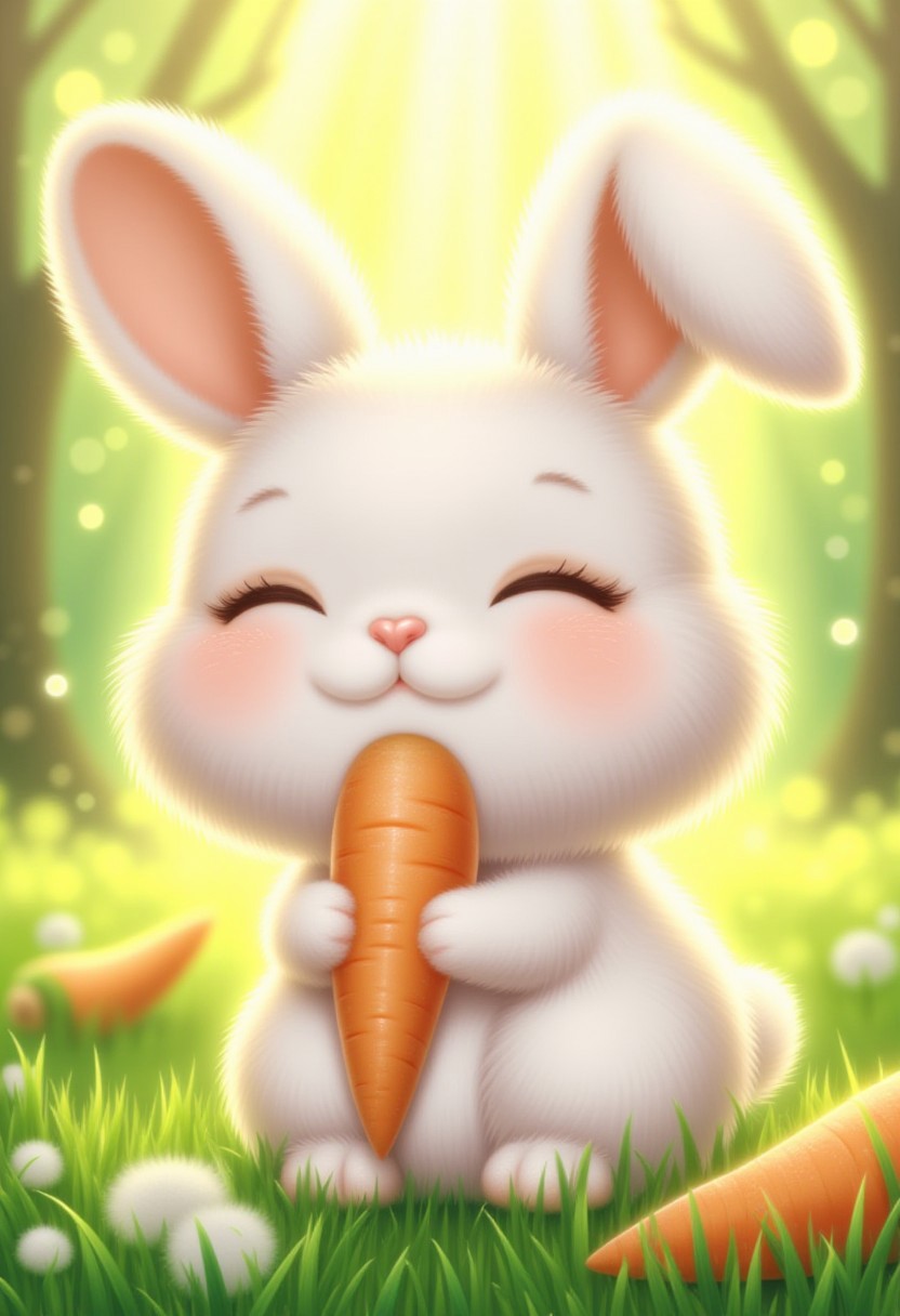 Cute bunny, munching on a carrot, blurred meadow background with soft bokeh lights, serene mood super cute wallpaper, anime, comic, bokeh , chibi animal, detailmaximizer