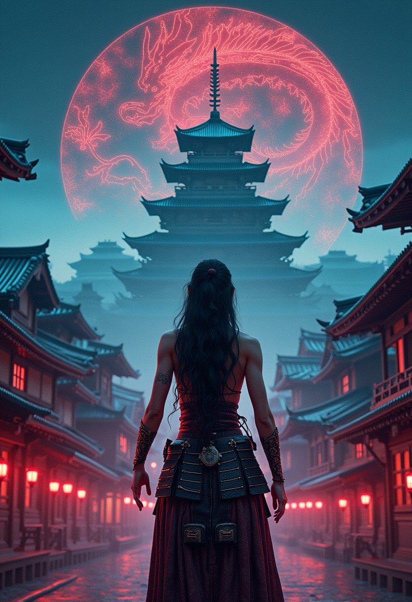 Cinematic shot. Masterpiece, professional, award-winning, hyperdetailed, 8k resolution, ultrarealistic, realistic depiction of the Japanese Edo period. The main background features traditional Japanese architecture, including samurai castles and wooden houses with tiled roofs, bathed in a neon afterglow. In the sky, a detailed electric dragon pattern creates a striking secondary background. The scene is viewed isometrically, with digital constructs subtly integrated. A Japanese girl in sleeveless samurai armor stands in the foreground, muscular, big biceps, hot, sexy, beautiful, angry, long hair, yazuka tattoos, ((torso shot)), arms raised, exuding a powerful presence. Inspired by Alphonse Mucha, the image highlights feminine elegance and intricate detail, capturing the wonder of the scene. absurdres. Pheonix. colorful. wallpaper. huge filesize. RAW photo.