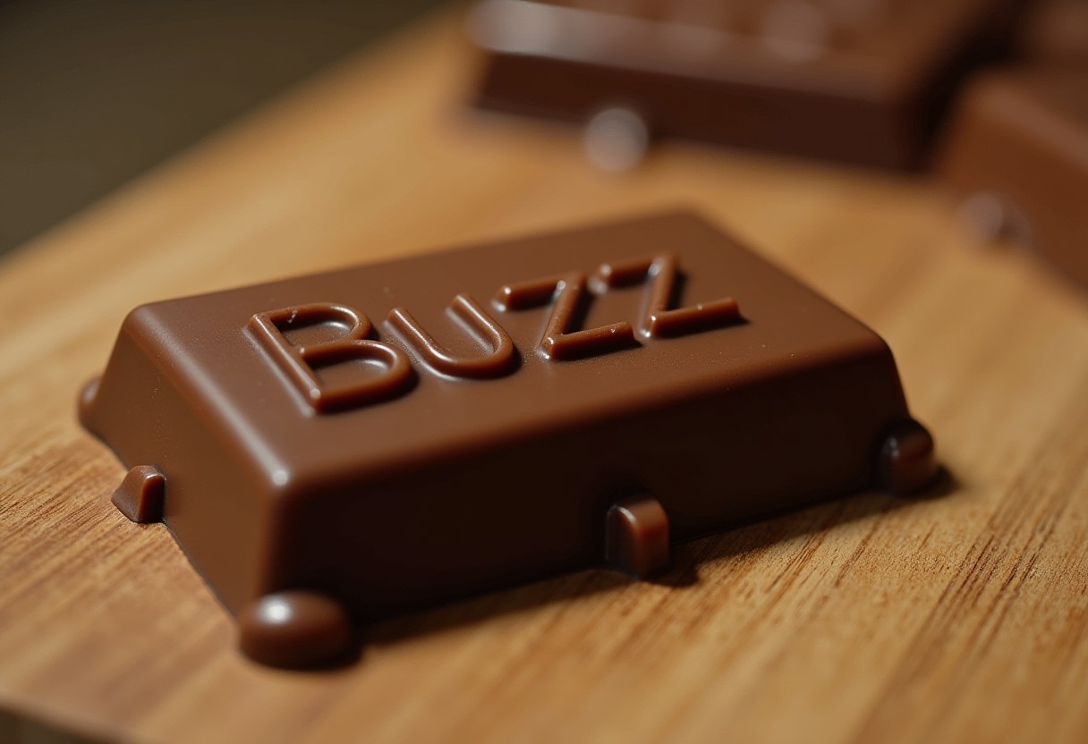 A piece of chocolate is placed on the table, on the surface a text is carved as: “Buzz”.